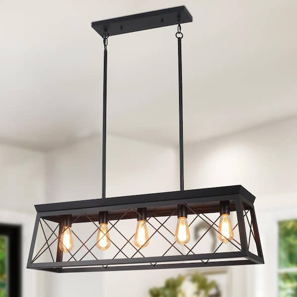 5-Light 37.8 in. W Vintage Farmhouse Matte Black Chandelier with Rectangle Light Shade for Kitchen Island Dining Room