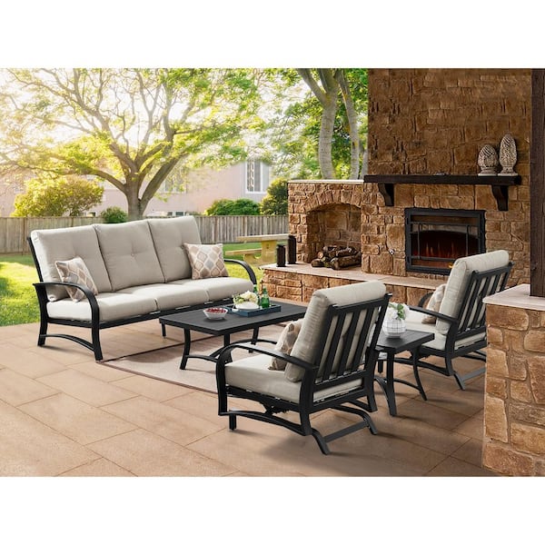5-Piece Aluminum Patio Conversation Set with Beige Sunbrella Cushions, 2 Rocking Chairs, Sofa, 2 Tables