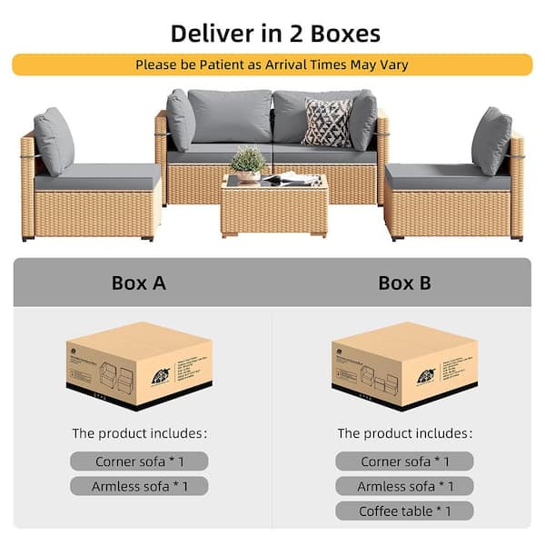 5-Piece Beige Wicker Patio Conversation Set with Light Gray Cushions and Coffee Table