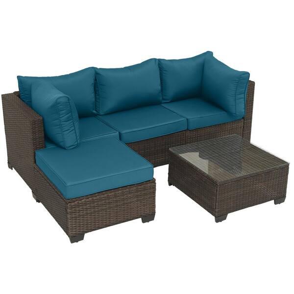 5-Piece Brown Hand-Woven PE Wicker Outdoor Patio Sectional Sofa Set with Peacock Blue Cushions and Coffee Table