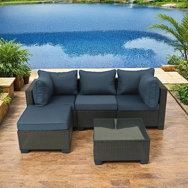 5 -Piece Dark Coffee Brown Wicker Outdoor Sectional Sofa Set with Dark Blue Cushion