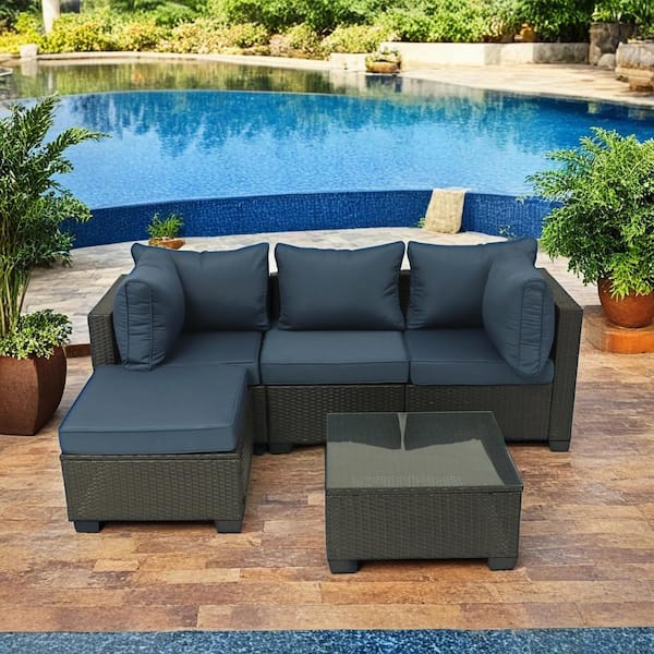 5-Piece Dark Coffee Rattan Wicker Outdoor Patio Conversation Set Sectional Sofa Set with Dark Blue Cushions