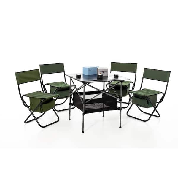 5-Piece Folding Aluminum Square Table and Chair Set for Outdoor Camping, Picnics, Beach, Backyard, Patio, Black/Green