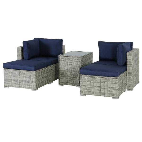 5-Piece Gray Wicker Outdoor Furniture Sectional Sofa with Blue Cushion and Coffee Table for Patio, Porch, Poolside