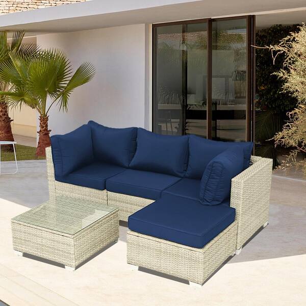 5-Piece Gray Wicker Outdoor Sectional Set with Table and Dark Blue Cushions