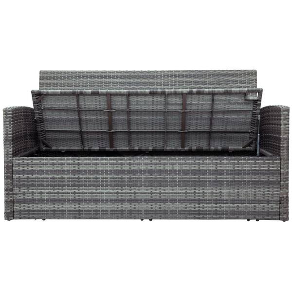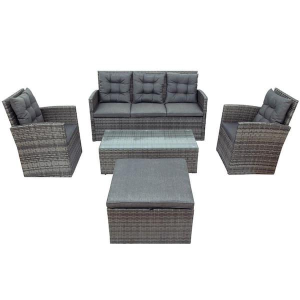 5-Piece Gray Wicker Rattan Outdoor Sectional Set with Cushions and Storage Bench