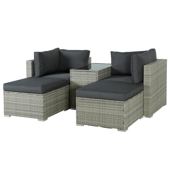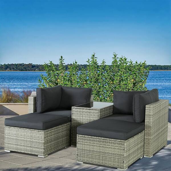 5-Piece Grey PE Wicker Outdoor Patio Sectional Set with Gray Soft Cushions 2 Ottomans & Coffee Table
