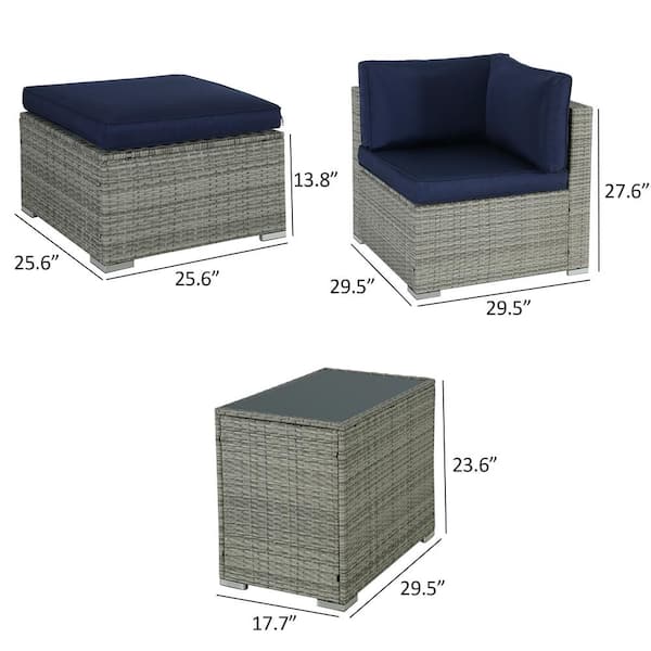 5-Piece Light Gray Rattan Wicker Patio Conversation Set with Blue Cushions