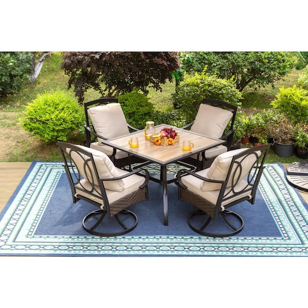 5-Piece Metal Patio Outdoor Dining Set with Square Wood-look Tabletop and Swivel Chairs with Beige Cushions