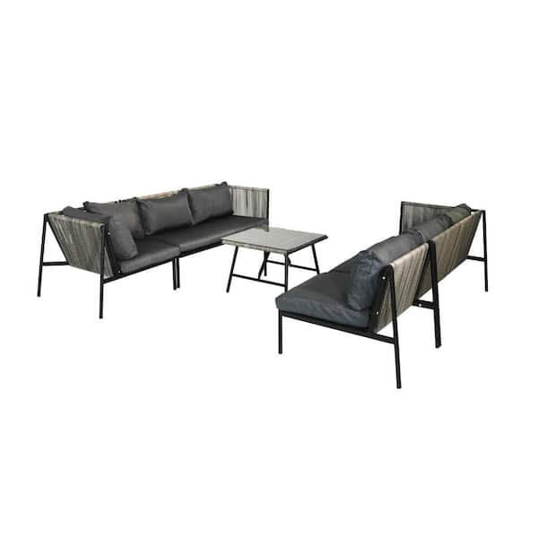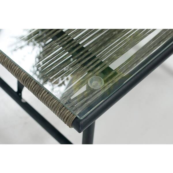 5-Piece Natural Outdoor Rattan Wicker Patio Conversation Set Garden Sofa Set with Black Cushions and Glass Top Table