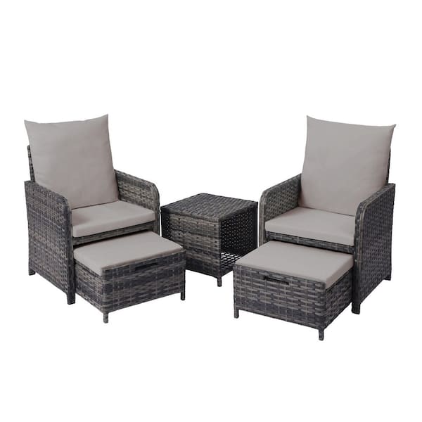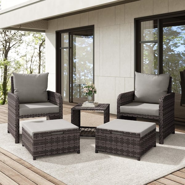 5-Piece Outdoor Brown Rattan Wicker Patio Conversation Sofa Ottoman and Table Set with Gray Cushions Lounge Chair