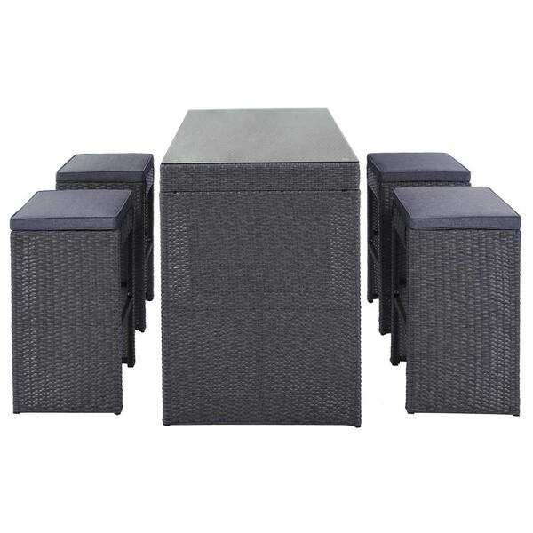 5-Piece Outdoor & Indoor Patio Furniture PE Rattan Wicker Bistro Dining Table Set Conversation Set w/Stools Gray Cushion