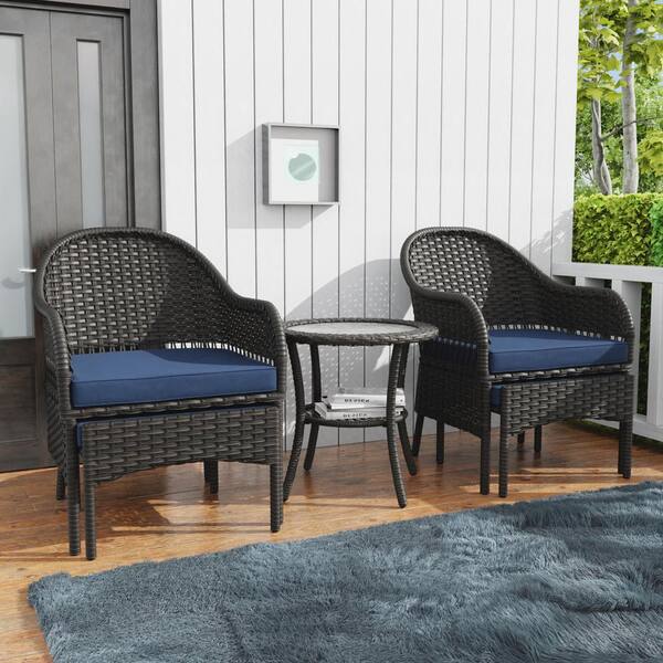 5-Piece PE Wicker Outdoor Patio Conversation Set with Navy Blue Cushions, Ottomans and Side Table