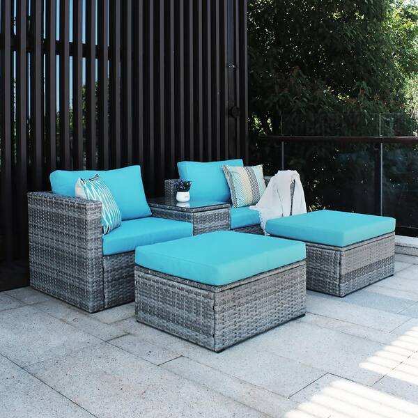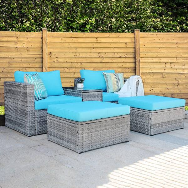 5-Piece Patio Conversation Set, Outdoor Garden Gray Wicker Rattan Sectional Sofa Set with Ottoman & Table, Blue Cushion
