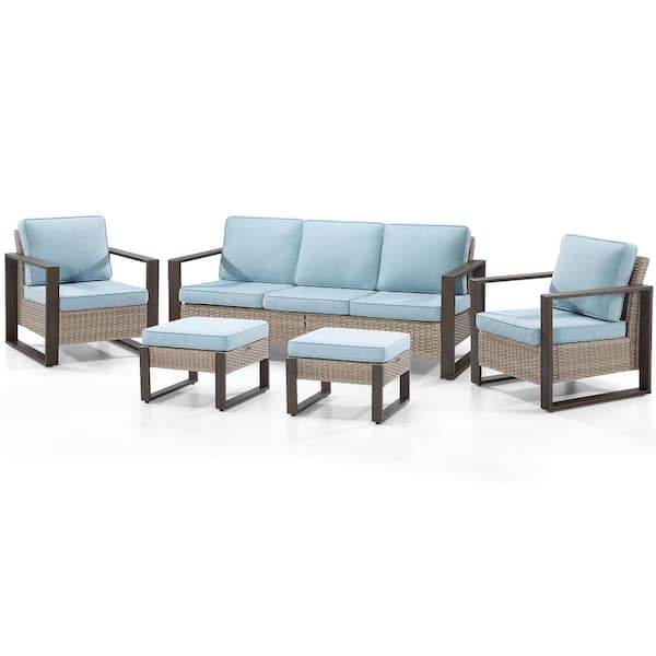 5-Piece Patio Wicker Outdoor Conversation Sectional Set with Steel Frame and Baby Blue Cushions