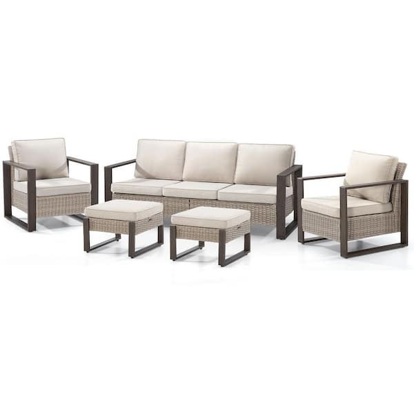 5-Piece Patio Wicker Outdoor Conversation Sectional Set with Steel Frame and Beige Cushions