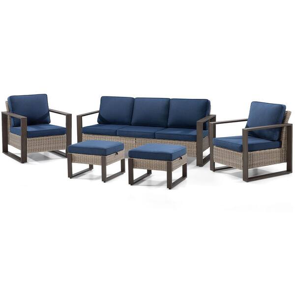 5-Piece Patio Wicker Outdoor Conversation Sectional Set with Steel Frame and Dark Blue Cushions