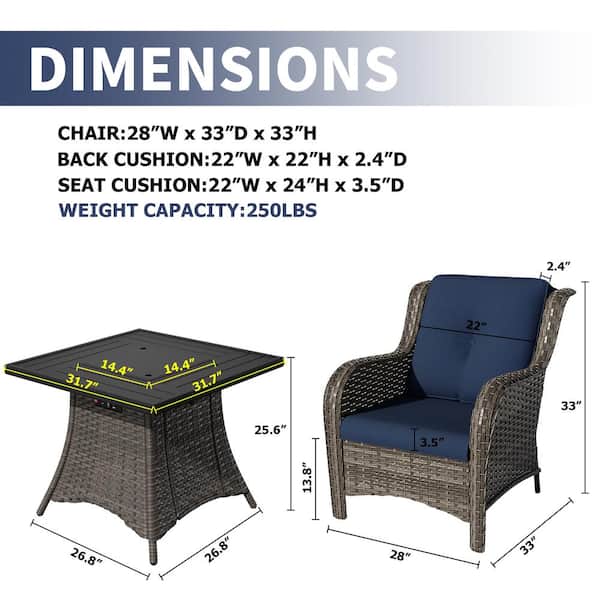 5-Piece Patio Wicker Outdoor Lounge Chair Set with Blue Cushions and Rectangular Fire Pit Table