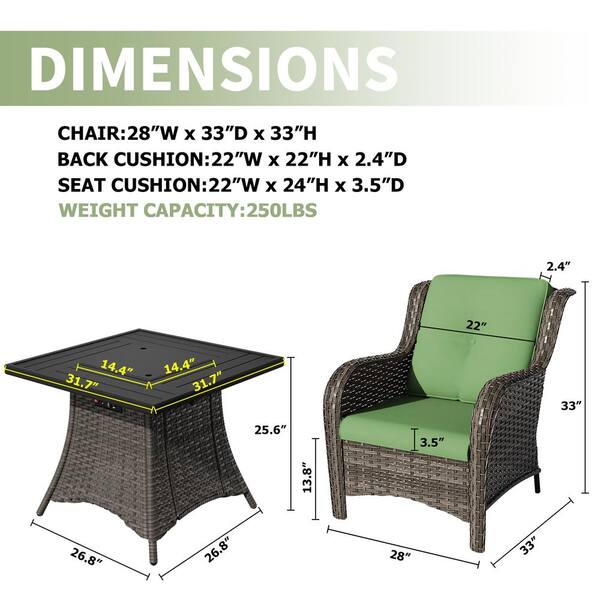 5-Piece Patio Wicker Outdoor Lounge Chair Set with Green Cushions and Rectangular Fire Pit Table
