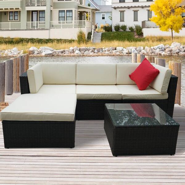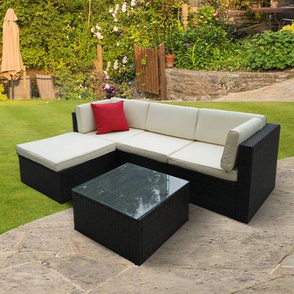 5-Piece Rattan Sectional Seating Group with Beige Cushion