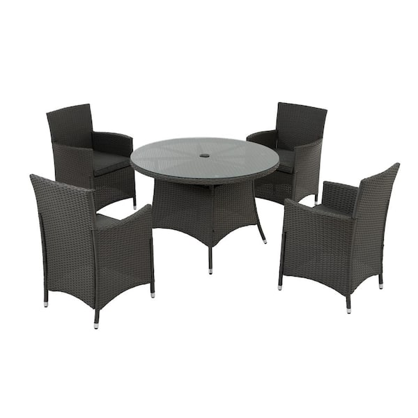 5-Piece Wicker Outdoor Dining Set, All-Weather Patio Dining Table and Chairs with Grey Cushions and Umbrella Hole