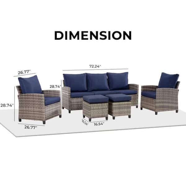 5-Piece Wicker Outdoor Dining Set with Washed Blue Cushion
