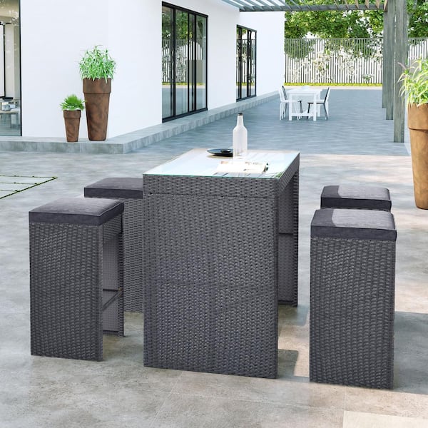 5-Piece Wicker Outdoor Dining Table Set with Gray Cushion