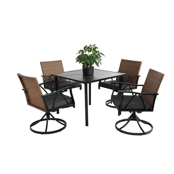 5 Piece Wicker Outdoor Dining Table and Chair Set, Patio Furniture Set with 4 Swivel Rocking Chairs, Gray Cushions