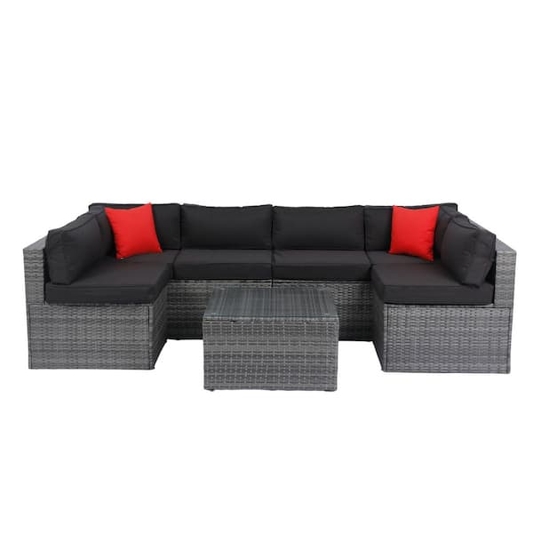 5 Piece Wicker Outdoor Furniture Sectional Sofa Reception Set with Black Cushions and 2 Pillows