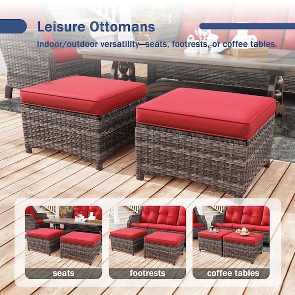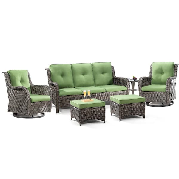 5-Piece Wicker Outdoor Patio Seating Set Sectional Sofa with Swivel Rocking Chair, Ottomans and Green Cushions