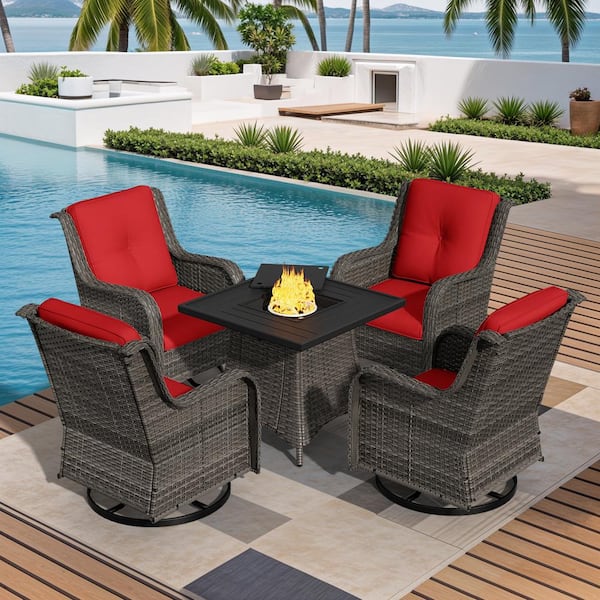 5-Piece Wicker Patio Conversation Set Swivel Rocking Chairs with Red Cushions and Rectangular Fire Pit Table