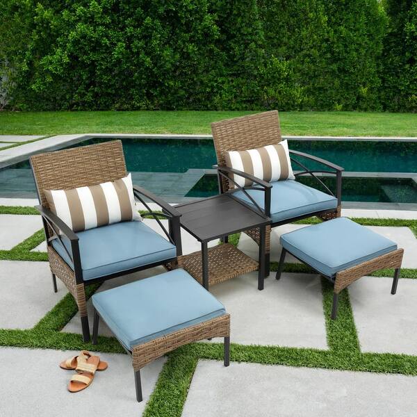 5-Piece Wicker Patio Conversation Set with Blue Cushions