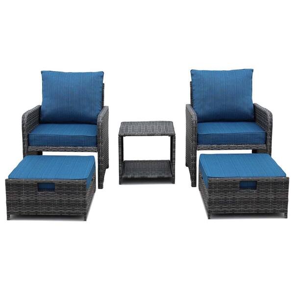 5-Piece Wicker Patio Conversation Set with Blue Cushions, Patio Chairs with Ottomans&coffe table Conversation Furniture