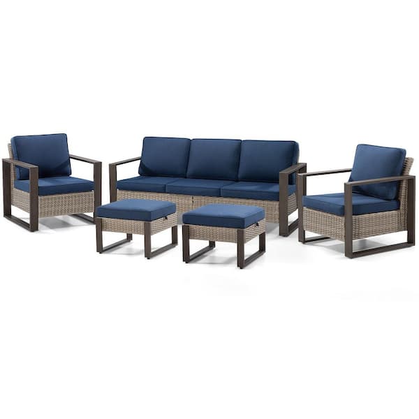 5-Piece Wicker Patio Outdoor Conversation Sectional Set with Steel Frame and Dark Blue Cushions