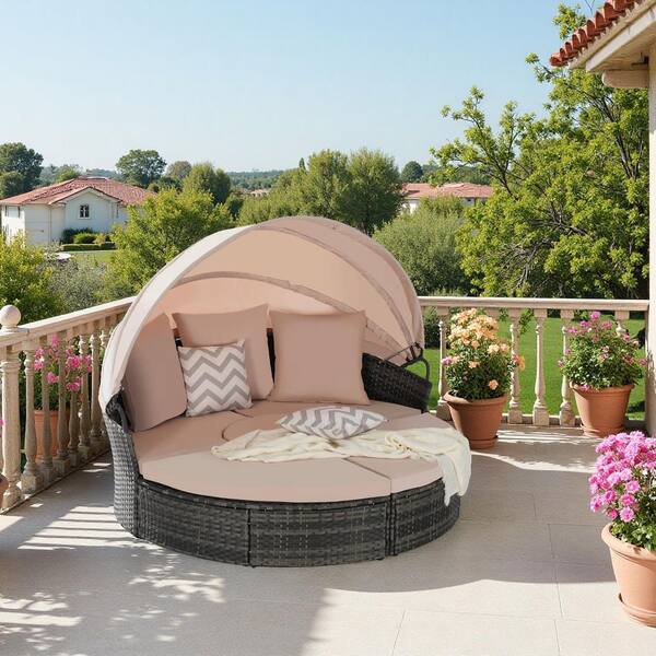 5-Piece Wicker Rattan Outdoor Patio Round Modular Day Bed Sofa Set with Retractable Canopy, Beige Cushions Pillows,Table