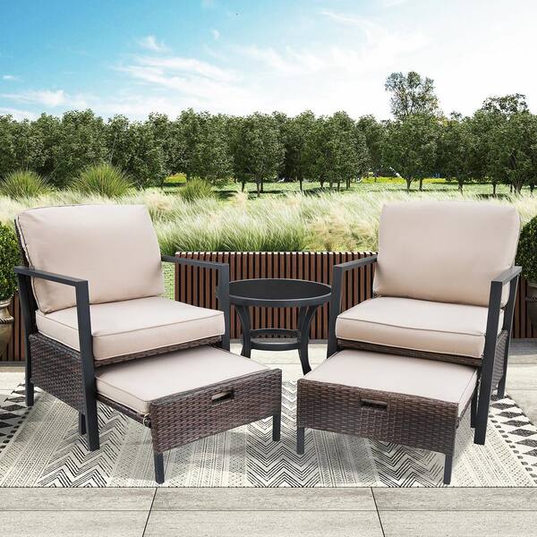 5-Piece Wicker Rattan Patio Conversation Set with Beige Cushions with Glass Top Side Table
