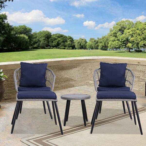 5 Pieces Wicker Patio Conversation Set, Outdoor Patio Furniture Set with Blue Cushions for Deck Garden Backyard Poolside