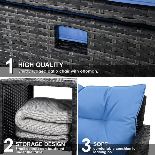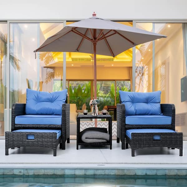 5-Pieces Wicker Patio Furniture Set Outdoor Patio Chairs with Ottomans, Blue Cushions