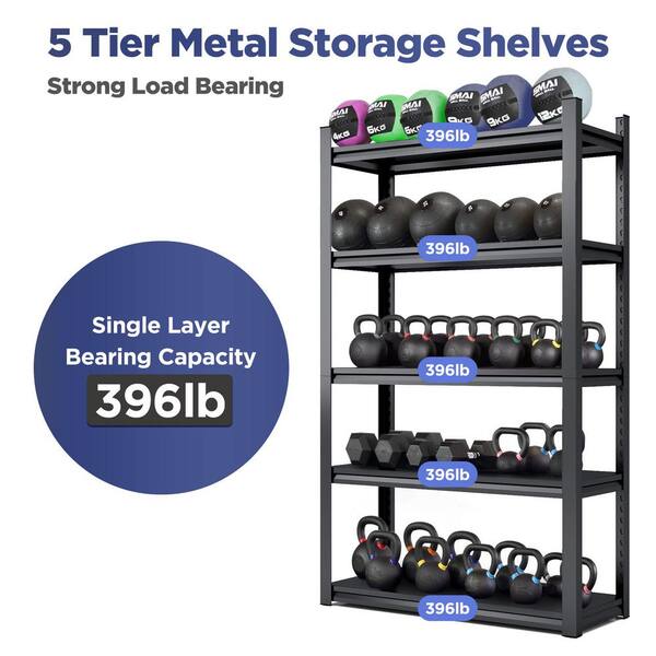 5-Tier Black Storage Metal Shelving, Adjustable Height, 2000 lbs. Heavy Duty Shelving