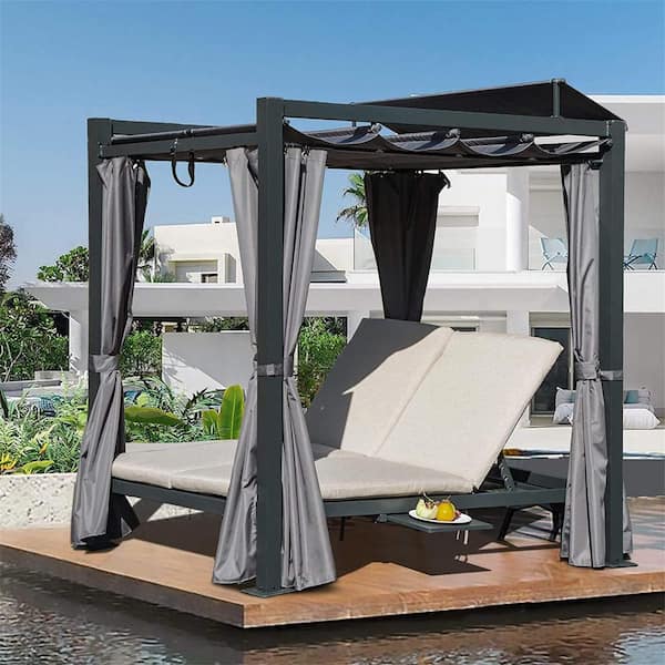 5 ft. x 7 ft. Outdoor Aluminum Double Chaise Lounge Patio Retractable Canopy Daybed with Beige Cushion & Cup Holder