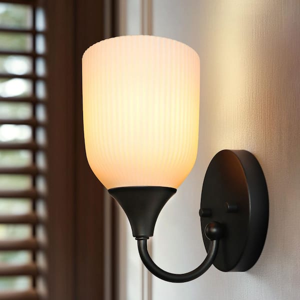 5 in. 1-Light Black LED Bathroom Vanity Light with Vertical Groove Glass Lampshade
