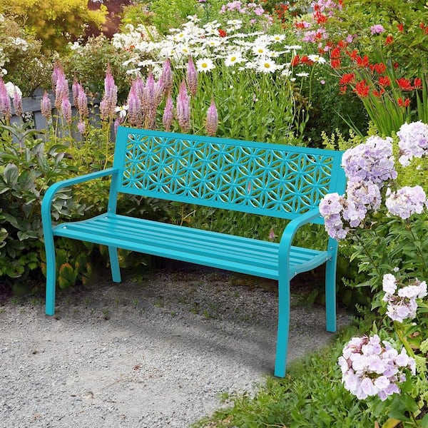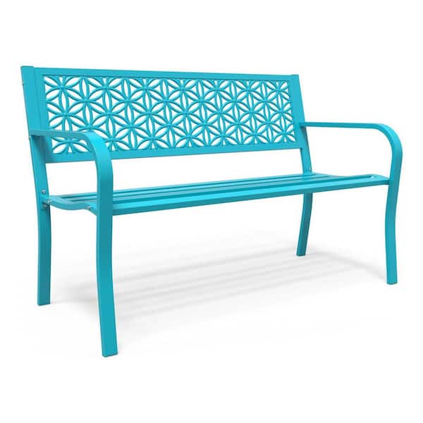50 in. 2-Person Blue Metal Outdoor Bench with Floral Back