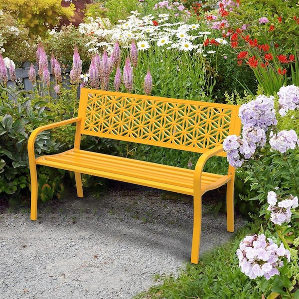 50 in. 2-Person Yellow Metal Outdoor Bench with Floral Back