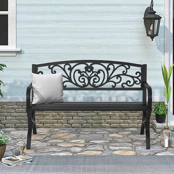 50 in. Black Metal Outdoor Bench with Armrests Slatted Seat and w/Floral Design Backrest