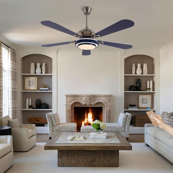 52 in. Indoor Blue and Silver Mute Ceiling Fan for Dining Room Bedroom with 3-Color Integrated LED Light and Remote