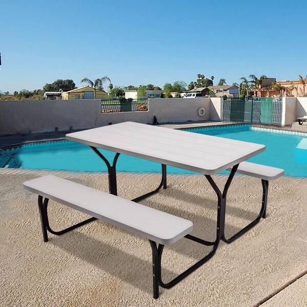 54 in. White Rectangle HDPE Outdoor Picnic Table Bench Set with Metal Base