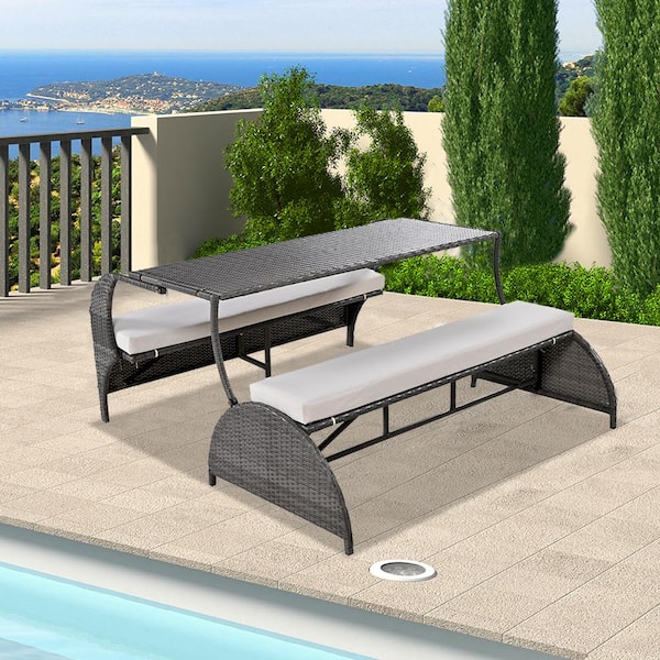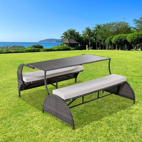 55.1 in. Beige Rectangle Wicker Picnic Table Seats 4 People Outdoor Loveseat Convertible Suitable for Garden and Lawn