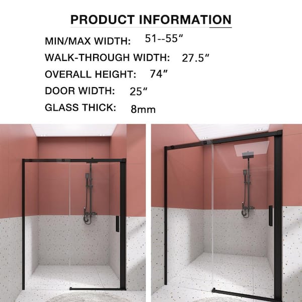 55 in. W x 74 in. H Sliding Framed Shower Door in Matte Black Finish with Clear Finish