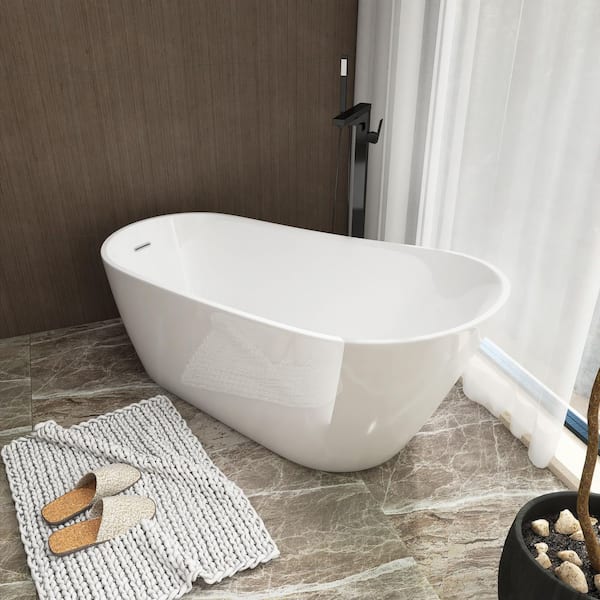 55 in. x 28 in. Glossy White Finish Acrylic Freestanding Flatbottom Soaking Bathtub with Chrome Overflow and Drain
