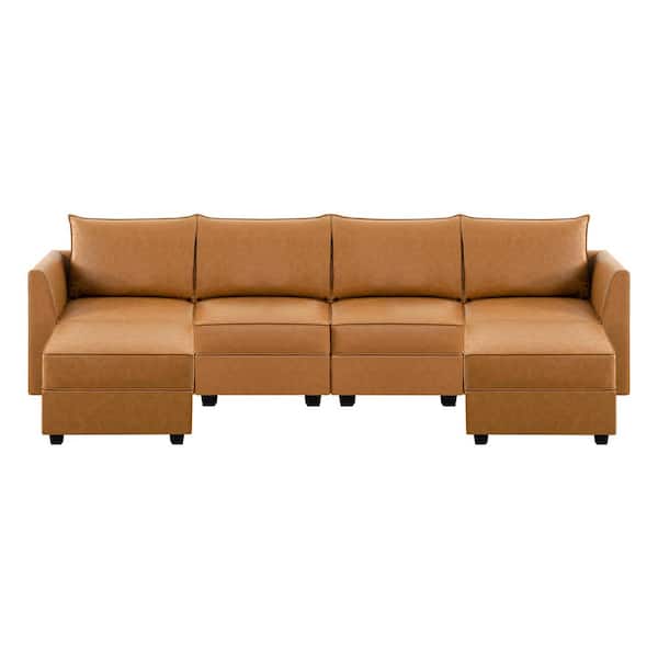 56.1 in. Modern Faux Leather U-Shaped Sectional Sofa with Reversible Chaise Sectional Sofa with Ottoman in Caramel